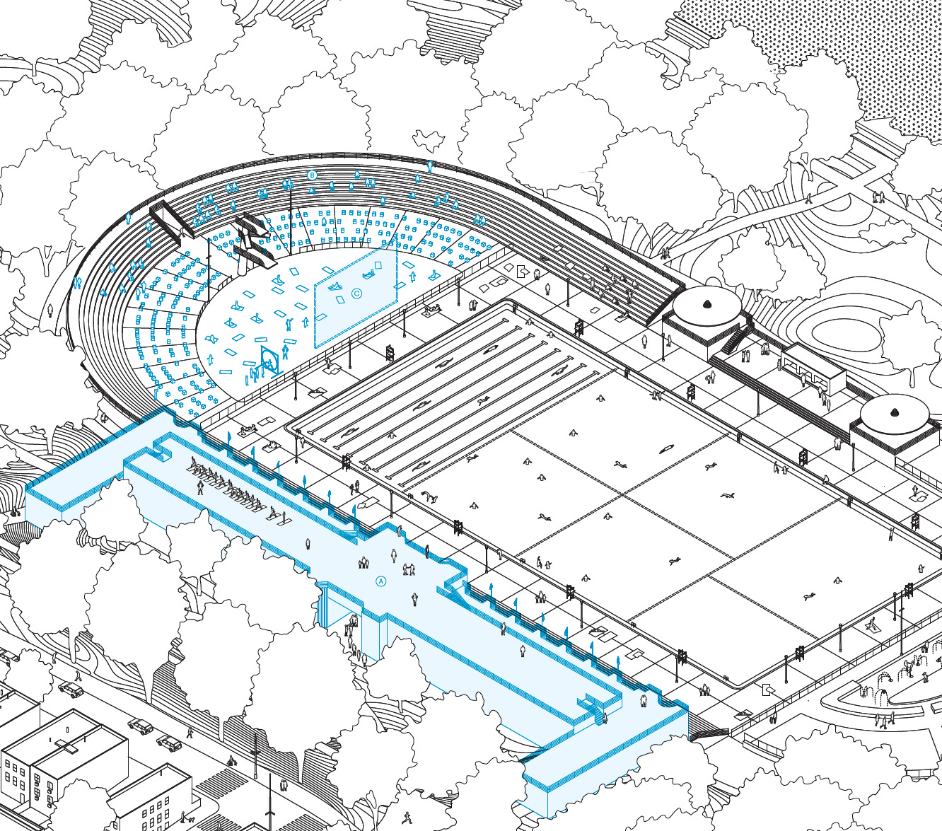 Karolina Czeczek proposes adapting all WPA pool buildings into cooling centers in the summer and warming centers in winter to build climate resilience. The former diving pool of the Astoria Pool (top image) could become a year-round performance venue, with its readymade auditorium waiting to host local dance and theatre groups, or film screenings.