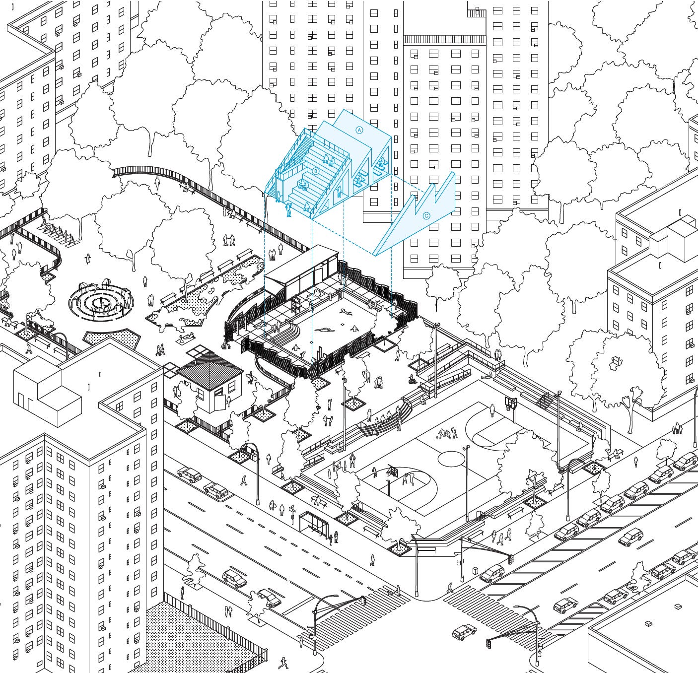 Czeczek imagines these humble pools covered in winter by structures housing public saunas, finally importing en masse to New York the Nordic art of sweating communally in a wooden box. Bleachers on top could host outdoor classrooms or neighborhood movie nights.