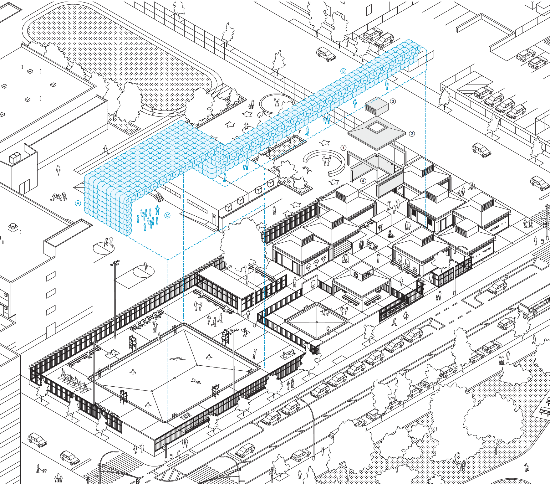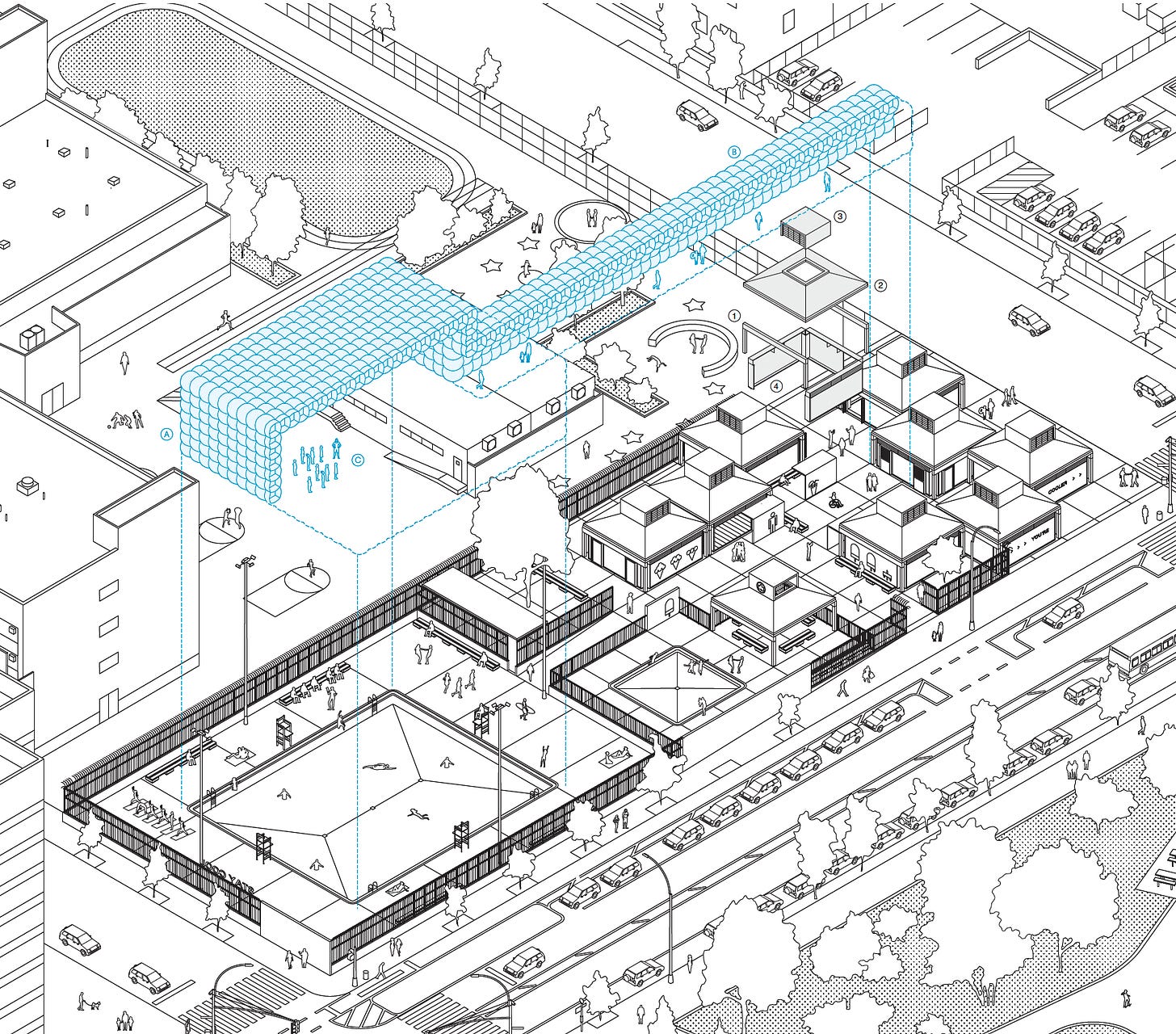 And then there are the vest-pocket pools of the seventies, compact rectangles squeezed into dense neighborhoods, each with a 75’ x 60’ intermediate pool and a 12’ x 12’ wading pool. For these, Czeczek proposes inflatable covers with a heated interior that would extend the free Learn to Swim program into the school year. More kids would acquire a critical life skill, and adults would gain an affordable way to exercise through the winter.